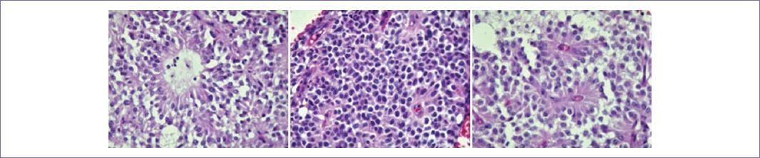 Figura 6 Cortes histológicos del tumor donde se identifica neoplasia epitelioide heterogénea con áreas papilares, rosetas y áreas sólidas de células neoplásicas ovoides, con citoplasma eosinófilo claro, en cantidad moderada con núcleos ovoides con cromatina vesicular y con indentaciones y nucleolos puntiformes.