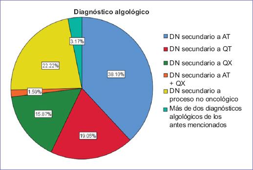 Sin embargo, en nuestro estudio se encuentran incluidas pocas pacientes a las que se atribuye diabetes mellitus como causa principal del DN, esto debido a que en nuestro hospital, al ser un centro de referencia oncológico, la principal etiología del dolor se debe a causas referentes a la patología oncológica, ya que en estos pacientes la causa del DN puede ser debida a múltiples factores relacionados con el manejo de su patología o a la invasión a tejidos adyacentes y de las vainas nerviosas, encontrando en nuestro estudio que el DN se asocia principalmente a la actividad tumoral.