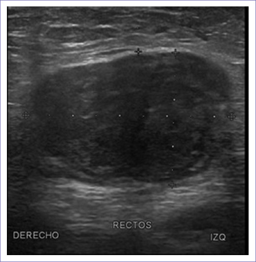 Acude por primera vez con médico general un mes previo a su llegada a nuestro servicio debido a que nota una parte de su abdomen sobreelevada y a la palpación nota masa, este la envía al servicio de cirugía general bajo sospecha de hernia. El cirujano general solicita tomografía computarizada (TC) de abdomen y pelvis con contraste oral e intravenoso en donde se observa lesión de tejidos blandos adyacente a la pared abdominal de los rectos anteriores con refuerzo de mas de 20 UH de forma homogénea con el medio de contraste con diámetros máximos de 37 x 40 x 29 mm infraumbilical y dos lesiones más con las mismas características anteriores y suprapúbicas. También se solicitó sonografía de pared abdominal, en la que se nos reporta una lesión por encima de los rectos anteriores en tejido celular subcutáneo de ecogenicidad heterogénea predominantemente hipoecoica con mínima vascularidad a la aplicación de Doppler color (Fig. 1) con diámetros de 39 x 28 x 43 mm (Fig. 2). Integrando el diagnóstico de tumores de pared abdominal, por lo que se solicitan estudios de extensión, laboratorios y se solicita biopsia por aguja de corte.