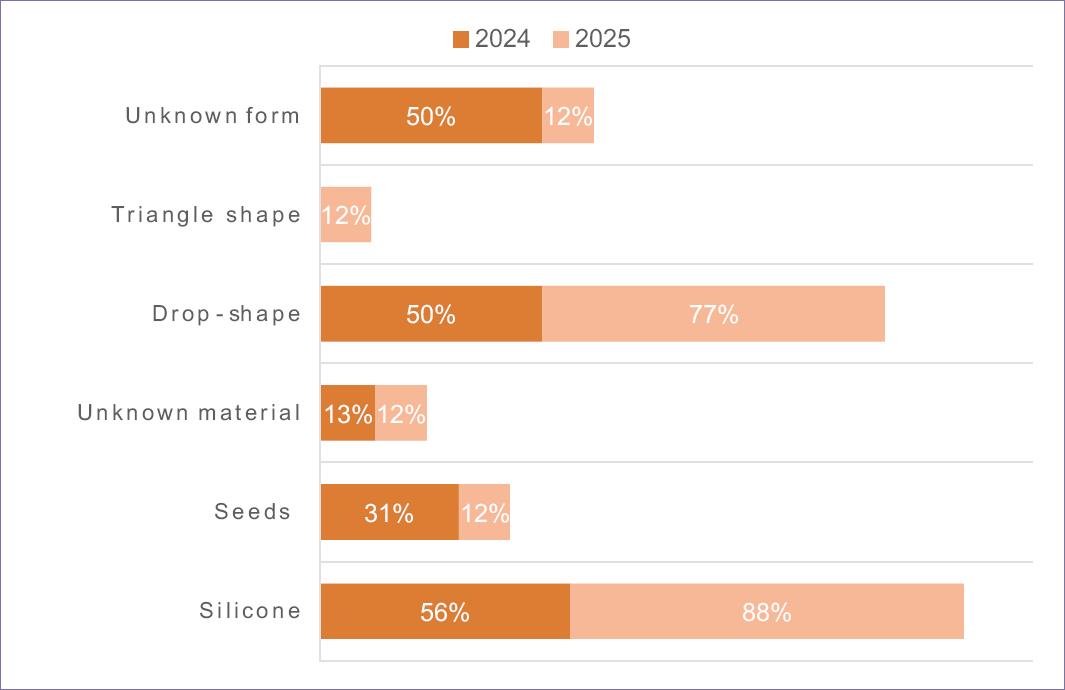 Regarding the shape of the SEBP, in 2024, a total of 62.5% of the participants were unaware of the specific shape of their prosthesis. However, in 2025, 76.82% of the participants were able to identify the drop shape of their prosthesis. For the material, 56.25 and 88.46% of the women reported that their prosthesis was made of silicone, 31.25 and 11.53% used prosthesis filled with seeds, and 12.5 and 0% did not know the material of their prosthesis (Fig. 2).