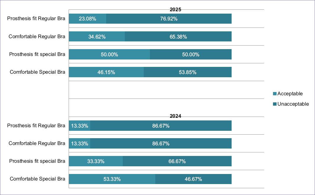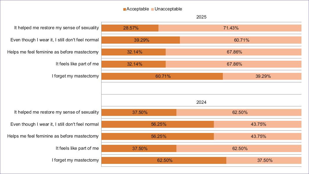 As shown in figure 4 (in year 2024 and in 2025), 62.5 and 60.71% of the women reported that using a prosthesis helps them forget about their mastectomy. However, 62.5 and 67.86% do not feel that the prosthesis is part of their body. In 2024, 56.25% feel more feminine when wearing it against 60.71% in 2025 that do not fell but 67.86% answered in 2025 that do not feel feminine. In addition, 62.5 and 71.43% believe that the prosthesis has not adequately restored their sense of sexuality. These responses were consolidated (grouping "very acceptable" and "acceptable" as acceptable, and "indifferent", "unacceptable" and "very unacceptable" as unacceptable) for analysis.