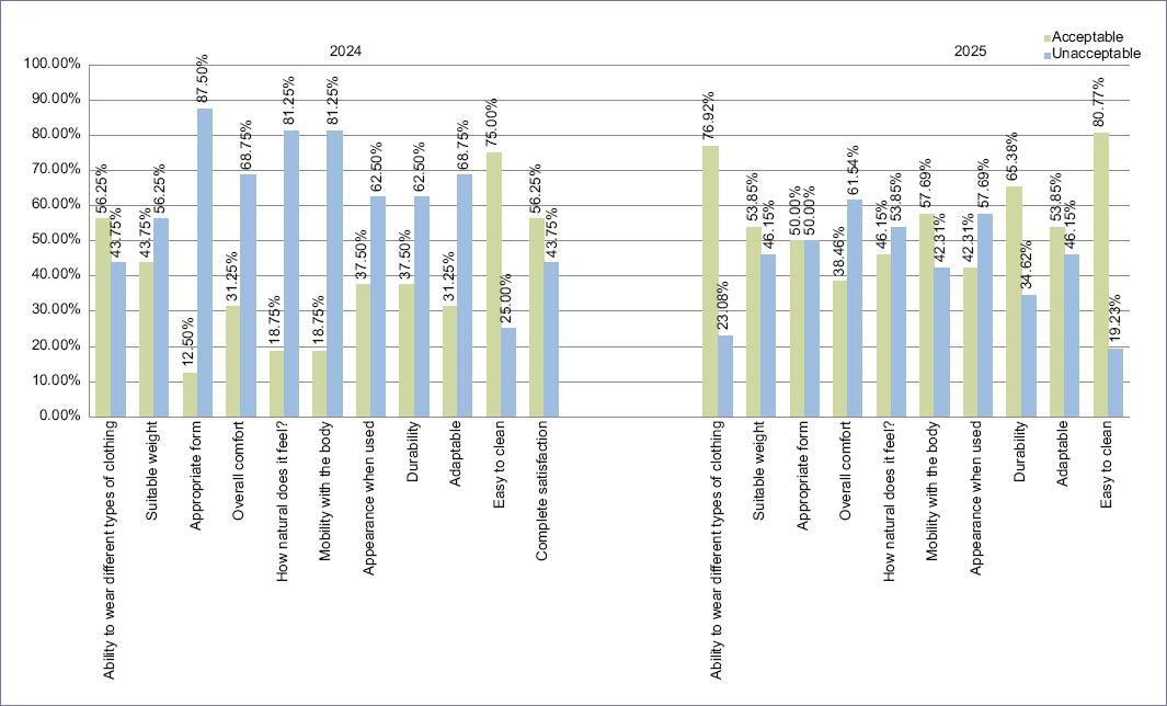 Satisfaction with the use of SEBP is shown in figure 5. The ability to wear different types of clothing was cited as an advantage by 56.25 and 76.92% of the participants in 2024 and 2025, respectively. The participants consider 43.75 and 53.85% suitable weight; 87.5 and 50% considered it of inappropriate form. In addition, 68.75 and 61.54 found the overall comfort of their prosthesis unacceptable.