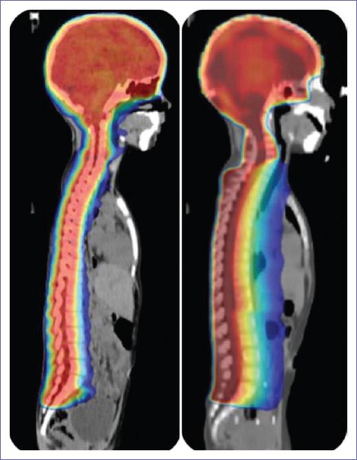 La irradiación cráneo-espinal (ICE) tiene un impacto en la supervivencia del 70% en tumores del SNC con alta probabilidad de diseminación por líquido cefalorraquídeo como el meduloblastoma, ependimoma, y tumores rabdoides atípicos y de células germinales5-8.