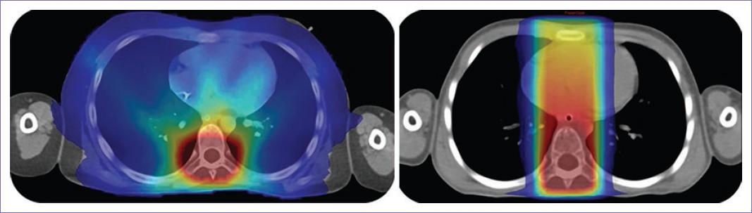 Figura 2 Tomografías en corte transversal. Se observa una irradiación simétrica tanto transversal como anteroposterior con un gradiente de dosis < 5 Gy en los centros de osificación primaria. El color rojo representa el 100% de la dosis y el azul, el 10. La imagen de la derecha corresponde a la técnica conformada y la izquierda a VMAT.