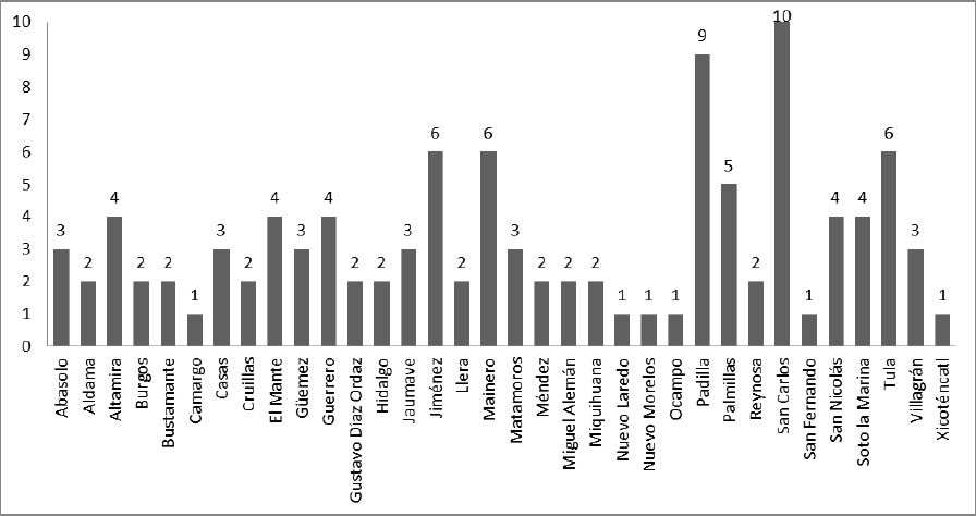 Al analizar las ciento ocho resoluciones de la ASE Tamaulipas de 2015 a 2017, se tiene que todas fueron procedimientos para el fincamiento de responsabilidades, en todos los casos se trató de resoluciones definitivas. En esas resoluciones hacen referencia a treinta y cuatro de los cuarenta y tres municipios que conforman el estado de Tamaulipas, no hay ningún procedimiento iniciado en Victoria -el municipio que alberga la capital del estado- y los municipios que más resoluciones tuvieron son San Carlos y Padilla (véase Figura 1), esto es, municipios rurales y con poca densidad poblacional.