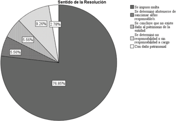 Respecto al sentido de las resoluciones, estas se clasifican en cinco categorías: 1) se impuso multa, 2) se determinó abstenerse de sancionar al/los responsable/s, 3) se concluye que no existe daño al patrimonio de la entidad, 4) se determinó no responsabilidad o sin responsabilidad a cargo y 5) existe daño patrimonial. En la Figura 2 se aprecia que en el 76.85% de las resoluciones se impuso una multa y en el 2.78% se determinó que hubo daño patrimonial, lo que indica que se comprobó la responsabilidad de los servidores públicos en la mayoría de los procedimientos que siguió la ASE Tamaulipas de 2015 a 2017 lo que, a su vez, evidencia que se trata de procedimientos seguidos por una causa debidamente justificada y sustanciada.