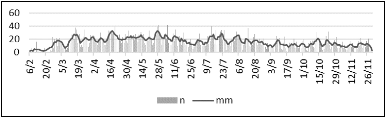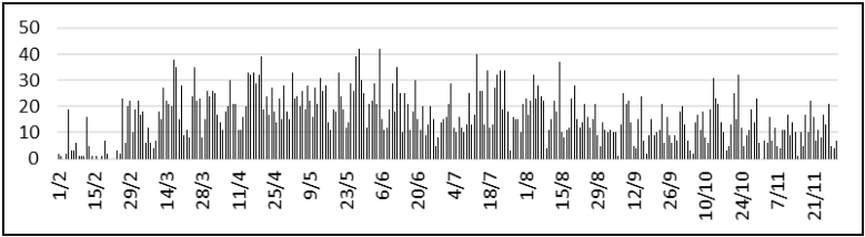 Para analizar las frecuencias e identificar los momentos relevantes se ubican los periodos de tiempo que recibieron mayor cobertura de acuerdo con el número de notas informativas impresas o transmitidas en los noticieros. La Figura 1 muestra la relación de días y frecuencias de noticias publicadas. Presenta movimientos en las frecuencias, crestas y valles que dificultan la interpretación.
