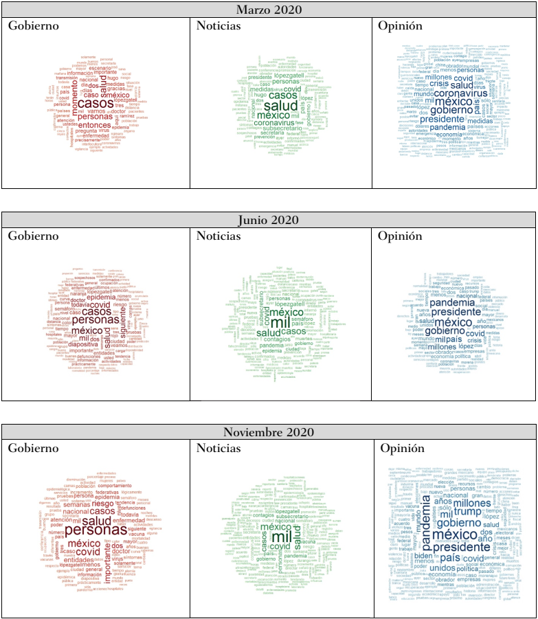 En los artículos de opinión, los temas que se agregaron fueron “empresas”, “emergencia”, “sanitaria”, “recursos”, “casa”, “trabajo”, “política” en abril; “seguridad”, “contagio” en mayo; “Trump” en junio; “educación”, “vacuna”, “inversión” y “desarrollo” en agosto; “crecimiento”, “recuperación” y “presupuesto” en septiembre; “resultados” y “mercado” en noviembre. Expresiones utilizadas en las conferencias vespertinas, son transmitidas por los medios usando sinónimos quizá con distinta connotación a la intención original de la fuente. Por ejemplo, en las conferencias vespertinas se hace uso habitual del término “epidemia”, mientras que en las noticias y las columnas se da preferencia a utilizar la palabra “pandemia”. Otro caso es que en las conferencias se usa el término “defunciones” mientras que en las noticias y artículos de opinión se da preferencia a las palabras “muertes” o “decesos”. En resumen, se ha identificado que durante la contingencia sanitaria se presentan cambios en el objetivo de los mensajes que se transmiten o reproducen. En los medios tradicionales destacan dos figuras, la del subsecretario Hugo López-Gatell y del presidente Andrés Manuel López Obrador. A lo largo de los meses existen cambios en los principales temas de discusión y una priorización diferenciada de ciertos temas. Otra característica observada es el uso de sinónimos empleados para informar, que pueden tener una connotación distinta a las palabras empleadas en las conferencias vespertinas. Una peculiaridad es que en todos los meses la palabra “crisis” aparece entre las diez palabras más frecuentes en los artículos de opinión.