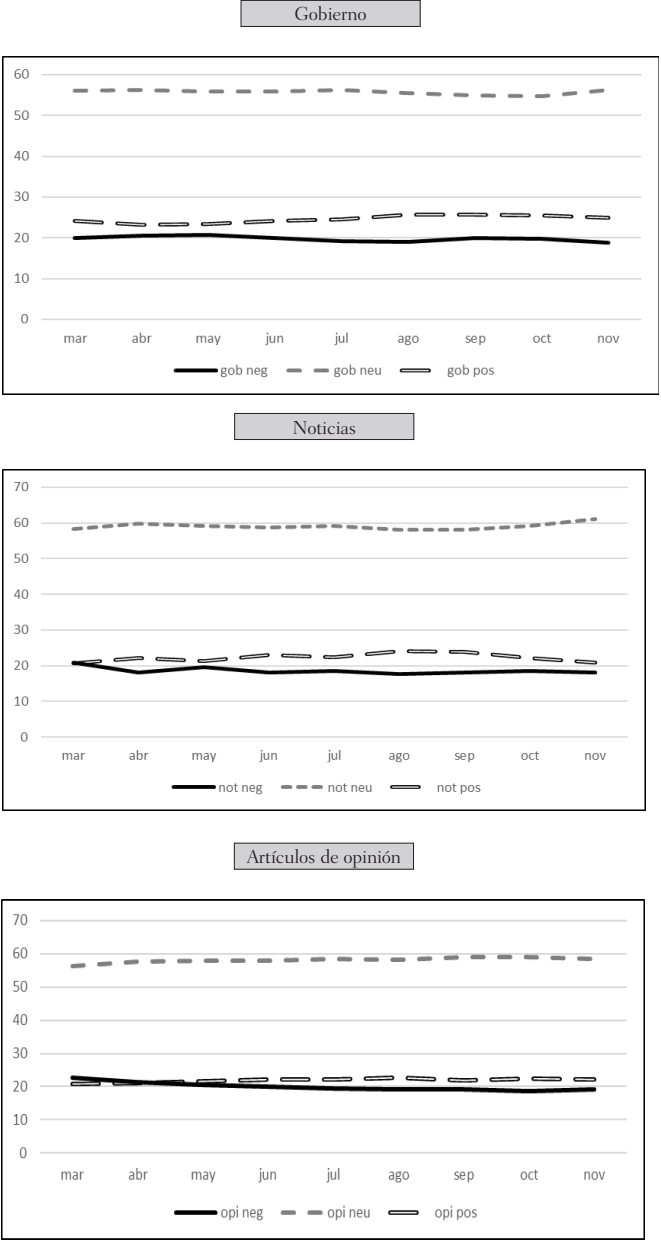 Contabilización. Obtenemos un resultado mensual de los tres sentimientos por grupo de análisis, con lo que se calcula la presencia relativa de cada sentimiento por grupo y por período, es decir, la proporción de sentimientos presente en gobierno, noticias y opiniones en el período marzo a noviembre de 2020.