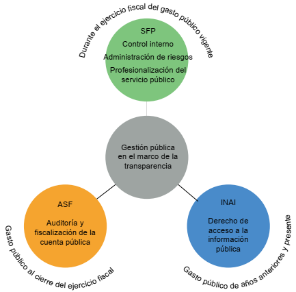 En México los órganos garantes de la transparencia son la Secretaría de la Función Pública (SFP), cuya responsabilidad administrativa está bajo el mandato del Poder Ejecutivo. En segunda instancia, el INAI un órgano constitucional autónomo; y, finalmente, la Auditoría Superior de la Federación (ASF), el cual es un órgano especializado de la Cámara de Diputados del Congreso de la Unión.