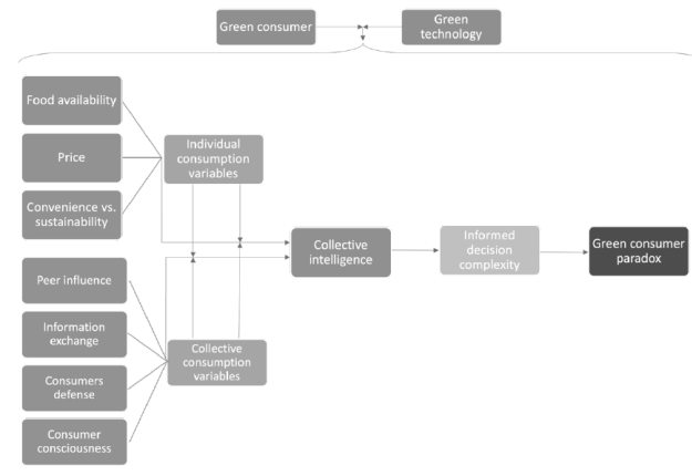 Collectivities can mitigate the paradox between green food and green consumers through different platforms and social connectivity (online and one-on-one). Nonetheless, food intake behavior is much more complex, and there are individual and collective variables that affect consumption decisions and, therefore, consumers' food intake behavior.