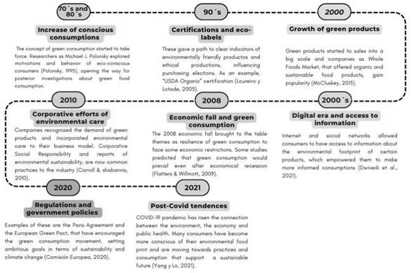 In the 60s and 70s, Eastern Europe started to worry about the consequences of consumption patterns and production in the environment due to health effects, industrial contamination, economic impact, and population increase. These concerns have become green consumerism, perceived as an environmental reform element, both in the Occident and the European Union, where the consumer gets involved as responsible and co-responsible (along with producers) to address environmental issues and adopt a more friendly environment lifestyle. It has resulted in the rise of a consumer that willingly, instead of normatively, is environmentally friendly and has been called a "green consumer" (Connolly & Prothero, 2008). Figure 2 has a timeline with some of the most representative events that have marked the evolution of green consumerism.