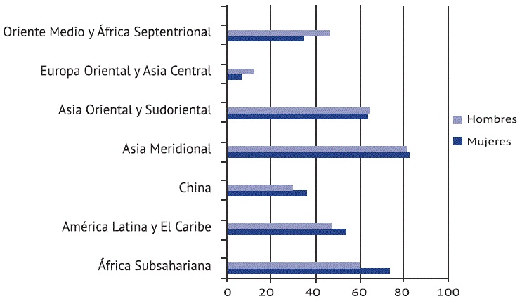 Si bien la cifra global no presenta una diferencia muy alta entre mujeres y hombres, en el nivel regional las desigualdades se acentúan. Por ejemplo, en el Sudeste Asiático y el Pacífico, 63.1% de las mujeres tenía un empleo vulnerable frente a 56% de los hombres (OIT, 2014). En el contexto de la deslocalización industrial, las diferencias se pueden leer desde el intercambio desigual que sostiene en ciertas regiones una división de las actividades productivas de menor valor agregado.