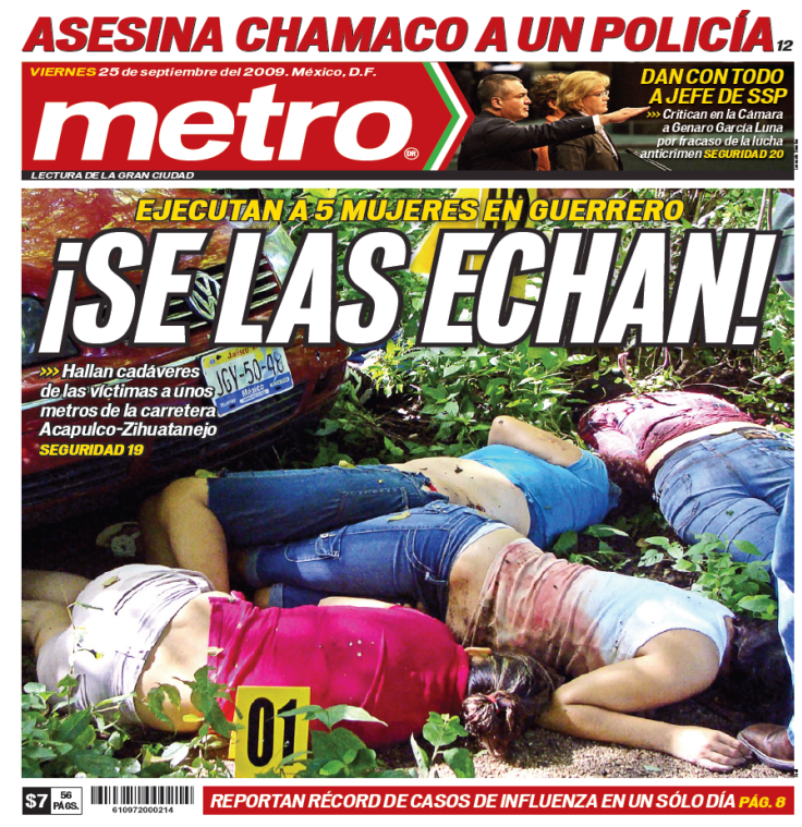 Por otro lado, en la portada del Metro, los cuerpos de las mujeres serían mostrados como prueba fehaciente de distintos crímenes. Las mujeres no solo han sido aniquiladas, sino reducidas a un cúmulo de carne. Una carne que ha sido abandonada debajo de un coche y que materializa gráficamente el hecho femigenocida. La evidencia no nos deja dudar ni por un segundo de lo que ha sucedido. Han sido ejecutadas cinco mujeres en Guerrero, según lo que se consigna por medio de la palabra escrita.