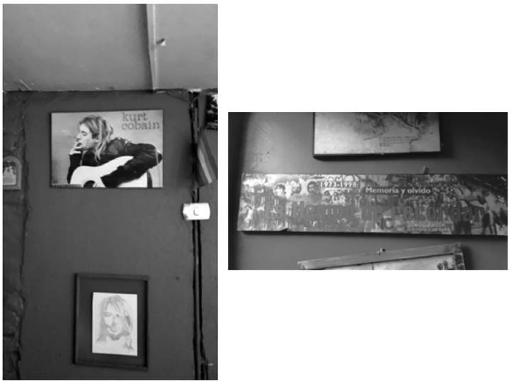 Violeta, por su parte, ha vivido siempre en la casa de su familia de origen y le ha resultado difícil constituirse como dueña de su espacio. Si bien le gustaría tener un espacio propio, no le ha sido posible conseguirlo en su barrio, lugar por el que siente mucho apego. Es así que su proceso de hacer hogar ha implicado apropiarse de su pieza, ubicada al fondo de la casa familiar. En su relato, nos contó que cuando a Alba y Matías (su pareja y el hijo de su pareja) lxs echaron de la casa donde vivían, Violeta lxs invitó a vivir con ella en su pieza. Hasta ese momento, sus padres no sabían de su orientación sexual: “no sabían nada, yo la traje como amiga”. A partir de ese momento, su pieza se transformó en su hogar: “mi hogar es mi pieza en que vivimos nosotros tres, ese es mi hogar”. Violeta ha ido apropiándose de su espacio a través de prácticas sutiles que, sin desafiar abiertamente el orden de sexo-género del hogar familiar, lo subvierten implícitamente. Por ejemplo, ella eligió el color de sus muros y los objetos, entre los cuales destaca la bandera arcoíris LGBTIQ+ y algunos cuadros alusivos a la dictadura militar que la conectan con la historia política del barrio en que vive (Fotos 2 y 3). En su pieza se escucha la música que a ella le gusta, cuyo contenido es de crítica social ante las condiciones de vida actuales. Así, Violeta encuentra en las letras de las canciones que escucha una forma de expresar experiencias y emociones para las cuales no ha podido sacar su propia voz. Al llenar la estrechez del espacio con música, se subjetiva y reafirma su identidad.