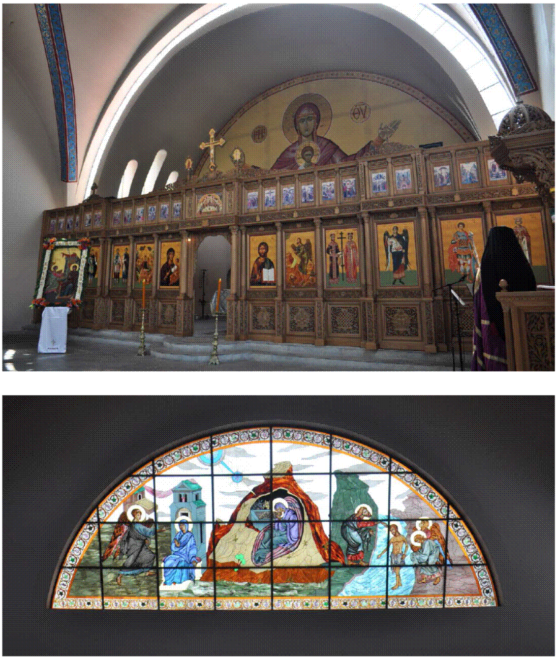 Figuras 1 y 2 Las imágenes sagradas están presentes en las iglesias ortodoxas en el mundo muchos siglos después de las controversias medievales entre la iconodulía y la iconoclastia. En las imágenes se aprecia el interior con el iconostasio y un vitral superior, ambos en la Catedral Ortodoxa Griega de Santa Sofía, en Lomas Hipódromo, Estado de México, obra de los arquitectos Rosell de la Lama y Manuel Larrosa, y cálculo de Félix Candela. Fotografías: Josué Pérez Sánchez, 2014.