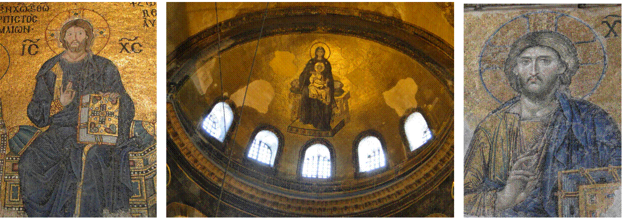 Figuras 3, 4 y 5 El epicentro de la querella iconoclasta se dio dentro del Imperio Romano de Oriente, pues no solo fue una controversia religiosa, sino que abarcó el ámbito político y social. Mosaicos al interior de la antigua Catedral Ortodoxa de Santa Sofía, en Constantinopla (hoy Estambul). Fotografías: Ivan San Martín (ISM), 2013.