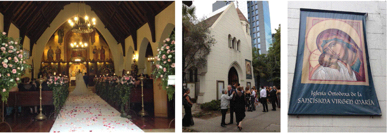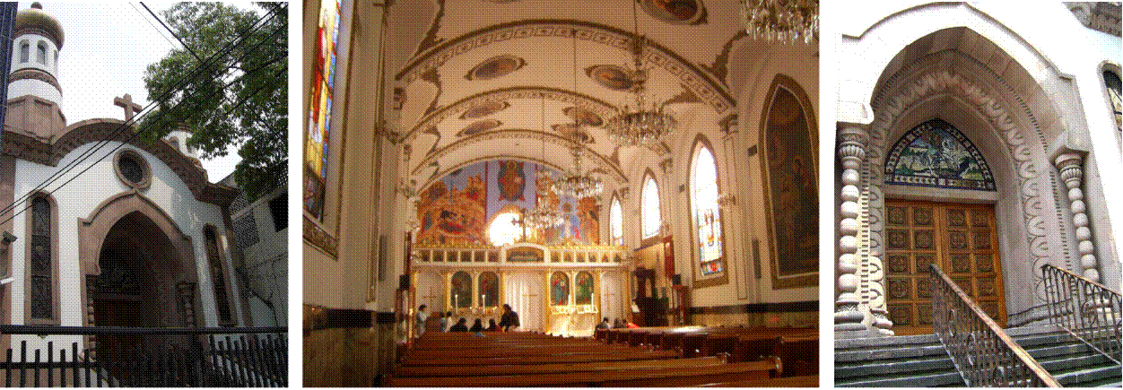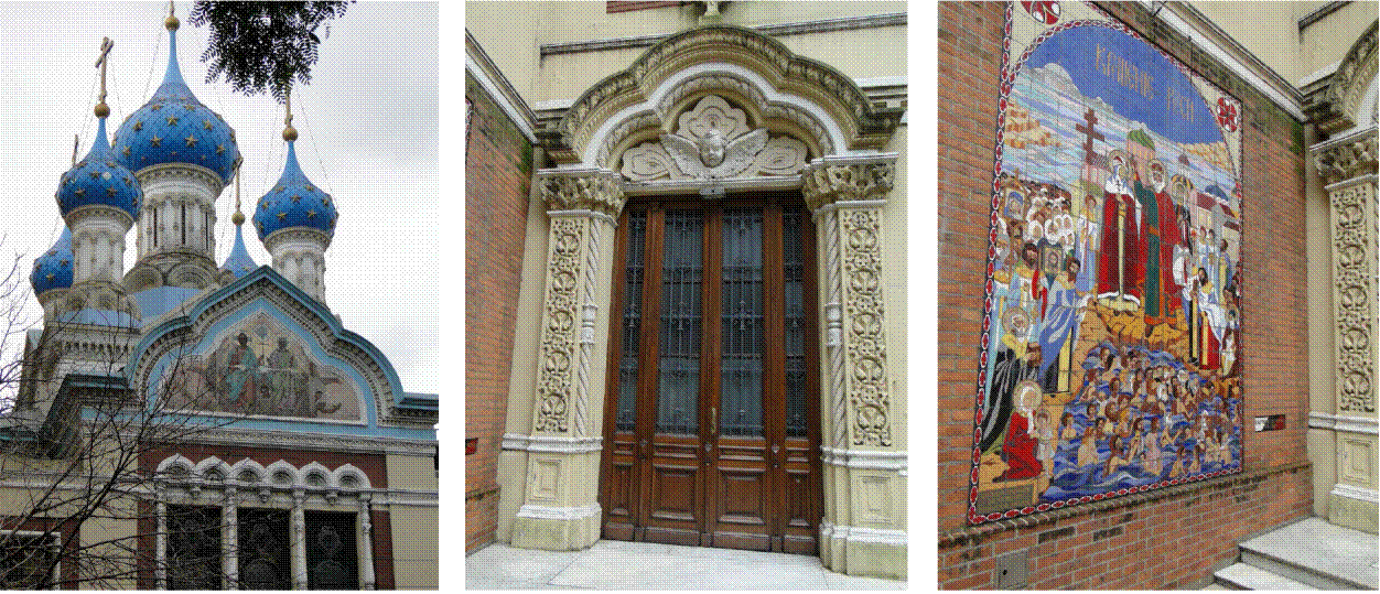 Figuras 6, 7 y 8 El mosaico de la Trinidad, el querubín bajo el arco y el mosaico junto al acceso continúan la tradición por la representación figurativa. Iglesia Ortodoxa Rusa de la Santísima Trinidad, barrio San Telmo, Buenos Aires, Argentina. Fotografías: ISM, 2012.