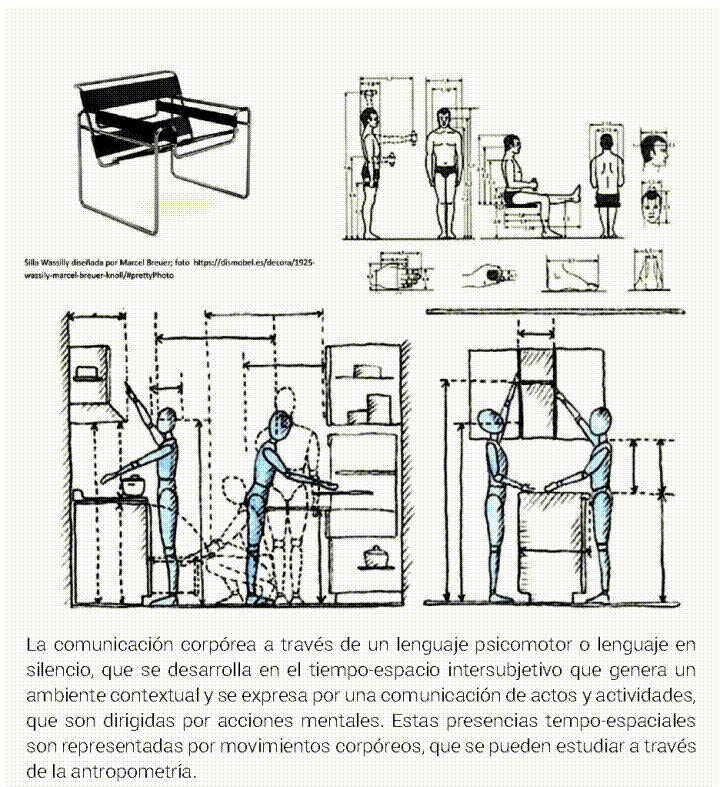 Cuarto. La comunicación corpórea a través de un lenguaje psicomotor o lenguaje en silencio, que se desarrolla en el tiempo-espacio intersubjetivo que genera un ambiente contextual y se expresa por una comunicación de actos y actividades, que es dirigida por acciones mentales. Estas presencias tempo-espaciales son representadas por movimientos corpóreos, que se pueden estudiar a través de la antropometría y ergonomía, dado su dinamismo. Para lograr este tipo de comunicación corpórea es necesario que el ambiente contextual lo permita tanto por las placas homeostáticas de vida como las condiciones climáticas-atmosféricas y, sobre todo, por los insumos necesarios para la subsistencia de la vida que alimenta el cuerpo-espíritu con sus posibles actos y actividades a realizar en el desarrollo de los nichos ecológicos del ambiente contextual. En la Figura 10 se presentan las relaciones entre las medidas del hombre estándar y los mobiliarios u objetos que requiere para realizar sus actividades (ver Figura 7). Cada espacio religioso requiere de estos estudios para realizar las actividades litúrgicas de los programas arquitectónicos siguiendo las normas eclesiásticas.