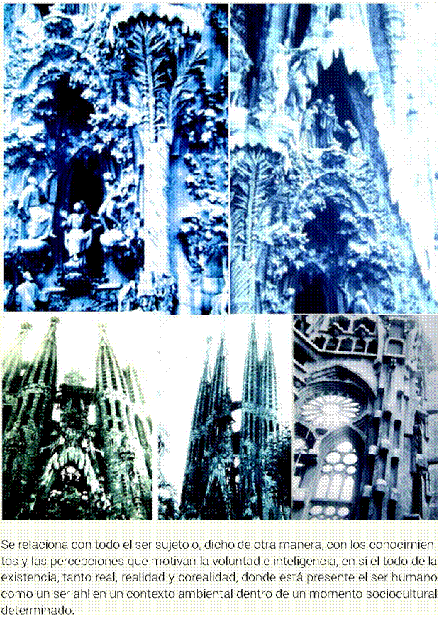 Estos rasgos son plasmados en la forma y pueden modificar las cualidades, cantidades y aun la misma sustancia de los entes, explotando sus cualidades, como son color, textura, solidez, etcétera, o también sus cantidades, como la masa o el volumen, entre otros, o sus propiedades químicas o físicas, logrando que los objetos artificiales comuniquen perceptos, conceptos y conocimientos, por medio de contenidos socioculturales, como símbolos, íconos, señales, huellas, etcétera (ver Figura 9). El generador de formas artificiales plasmará rasgos que evocarán esencias socioculturales para ser comunicadas a otros individuos socializados; es, además, una comunicación de rasgos esenciales, que genera empatías o rechazos a lo plasmado en materia de forma artística. Estas situaciones son cuidadas en los ambientes religiosos por la liturgia católica para evitar el rechazo. El ambiente contextual, tanto artístico, arquitectónico y urbano, tiene convivencias simbióticas que reúnen lo real, la realidad y la correalidad o interpretación trascendental mental, por lo que es importante evocar apercepciones religiosas positivas y cuidando los valores religiosos.