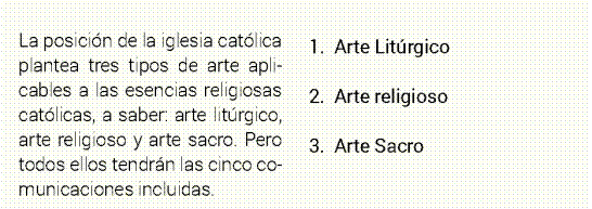 La posición de la Iglesia católica plantea tres tipos de arte aplicables a las esencias religiosas católicas, a saber: arte litúrgico, arte religioso y arte sacro. Pero todos ellos tendrán las cinco comunicaciones incluidas.