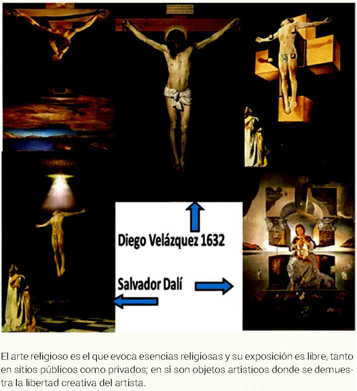 El arte religioso es el que evoca esencias religiosas y su exposición es libre tanto en sitios públicos como privados. En sí son objetos artísticos donde se demuestra la libertad creativa del artista. Son formas de expresión de vivencias socioculturales imperantes que integran los movimientos artísticos del momento y las convivencias de las vidas cotidianas de los pueblos, dentro de una libertad creativa, que permite expresar, tanto vivencias como emociones religiosas, que son plasmadas en la materia con el manejo libre de preceptos, emociones y sentimientos, que evocan los valores religiosos del momento. En la Figura 14 se presentan varias pinturas que se refieren a Jesucristo, una de ellas es Diego Velázquez en 1632 y las cuatro pinturas de Jesucristo fueron pintadas por Salvador Dalí.