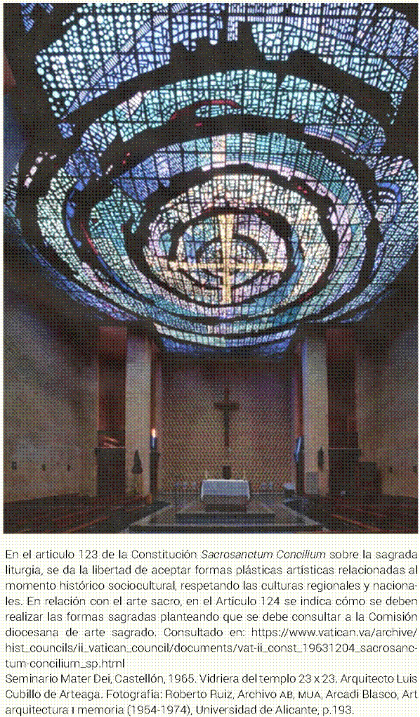 Cada protocolo litúrgico cambia los campos simbólicos de convivencia con variaciones tempo-espaciales que modifica los programas arquitectónicos, tanto el programa general conceptual como el programa particular de las actividades y sus necesidades de espacio y mobiliario, en sí, todo el ambiente religioso y con ello todas las expresiones artísticas contenidas. Así, se obtiene como resultado un nuevo carácter arquitectónico contextual ambiental de todas las expresiones formales artísticas del arte religioso y sacro. Las nuevas propuestas litúrgicas resultantes del Concilio Vaticano II definieron cambios en los ritos y las normas a seguir en el espacio arquitectónico y, por ende, cambiaron las expresiones de formas artísticas en general,5 como se puede notar en la Figura 8 con el empleo de nuevas técnicas constructivas que dieron cambios sustanciales del carácter arquitectónico.