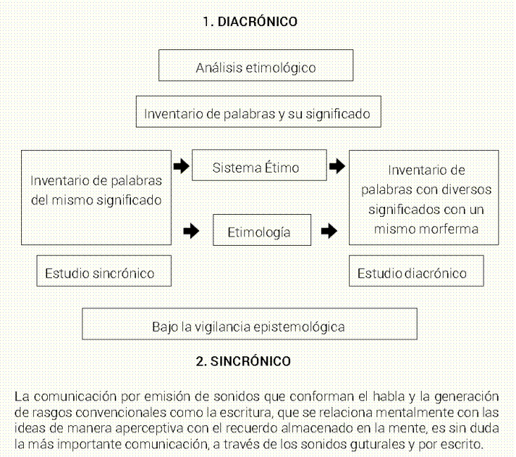 Primero. La comunicación por emisión de sonidos que conforman el habla y la generación de rasgos convencionales como la escritura, que se relacionan mentalmente con las ideas de manera aperceptiva con el recuerdo almacenado en la mente. Esta es, sin duda, la más importante comunicación, es decir, a través de los sonidos guturales y los rasgos escritos y dibujos expresivos. Desde el punto de vista de la semántica lingüística, existe un desarrollo generacional cultural denominado semántica lingüística diacrónica que analiza las maneras que se formaron las palabras a través del tiempo con sus sememas y fonemas, para después valorar esas palabras en el momento histórico actual dentro de lo que se denomina semántica lingüística sincrónica. En la religión católica se buscan las relaciones entre dibujos u objetos de arte de escenas religiosas que dan sentido a las imágenes mentales, relacionándolas con la palabra expresada lingüísticamente y escrita. En la actualidad, con la política de endoculturación o acciones interculturales católicas, se pretende respetar los actos religiosos en la lengua materna, así como las costumbres y tradiciones de los pueblos y aun más de las propias familias, por lo que la comunicación de mensajes religiosos se apoya con representaciones artísticas de escenas pintadas o con objetos escultóricas. La relación diacrónica de la raíz lingüística y su seguimiento en el tiempo en diferentes lenguas hasta entender el significado sincrónicamente debe enriquecer el lenguaje religioso sin ser una imposición, sino un enriquecimiento a las significaciones actuales (ver Figura 3).