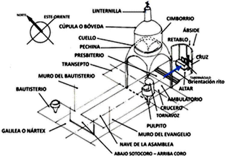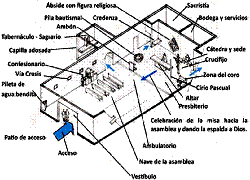 En la religión católica se han realizados dos concilios donde se teorizaron las situaciones que tenía la Iglesia católica en su momento de gran importancia, que influyeron en las vidas públicas religiosas y los comportamientos en los campos simbólicos que trajeron a su vez diferencias esenciales que modificaron los modos del ser religiosos. Estos cambios fueron producto de los movimientos sociales que imperaron en sus momentos: el Concilio de Trento del siglo XVI (1545 a 1563), que definió nuevas normas litúrgicas y éticas sobre la doctrina de la iglesia como respuesta de contrarreforma a la reforma protestante que estaba desarrollándose, y el Concilio Vaticano II del siglo XX, iniciado en 1962 y concluido en diciembre de 1965,4 como respuesta a los avances científicos-culturales que se lograron a finales del siglo XIX y principio del siglo XX, sobre todo los producidos por las dos guerras mundiales que cambiaron la normalidad en las convivencias sociales, dando como resultado nuevos protocolos de comportamiento en los actos religiosos y litúrgicos de la vida religiosa de los católicos, generando nuevos programas y carácter arquitectónicos, como se presenta de manera sintética en las Figuras 5 y 6 por medio de una axonometría de una planta arquitectónica que sintetiza el programa arquitectónico tridentino y la fotografía de la fachada de iglesia de la Merced ubicada en la ciudad Antigua, en Guatemala; ambas figuras ejemplifican el carácter arquitectónico del Concilio Tridentino. En comparación se presentan los cambios arquitectónicos promovidos por el Concilio Vaticano II con la Figura 7, que es una axonometría de una planta arquitectónica con los cambios normas y actos litúrgicos apoyados por el Concilio Vaticano II del siglo XX.