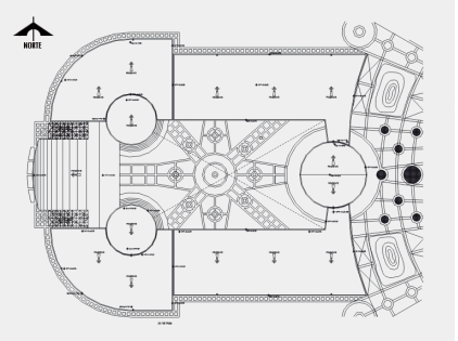 Esquema compositivo general de organización radial, dando como resultado algunos espacios cuyo desarrollo conformó, en planta, trapezoides o secciones semicirculares; destacan las geometrías cilíndricas en Arquitectura y Artes Plásticas;