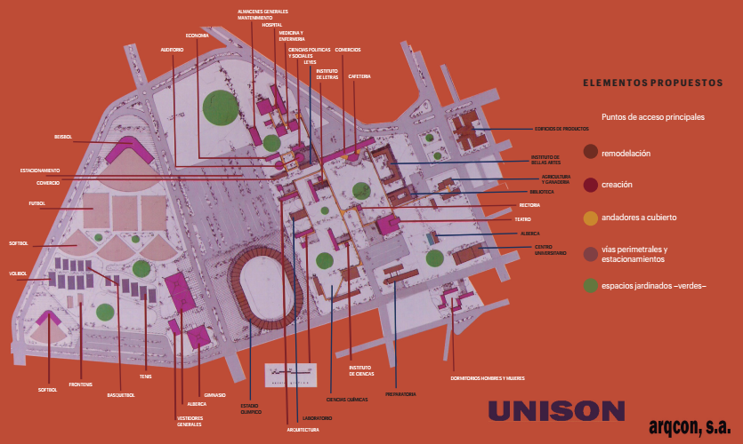 El concepto de Plan Maestro también obedece a una inserción mucho más armónica de la Universidad con el espacio de la ciudad. Sin duda, el objetivo central era convertir el campus universitario en un espacio de la ciudad pero visto no como uno para automóviles, sino como un espacio para que los ciudadanos, los habitantes de la ciudad de Hermosillo pudieran entrar y salir y encontraran en el campus universitario un posible lugar de paseo, de visita y con una inserción mucho más armónica, sobre todo considerando que en Hermosillo, una de las grandes carencias es precisamente espacios urbanos para la convivencia, espacios que den calidad de vida, espacios adecuados más allá de los que se han venido construyendo que son en una proporción mucho menor.15