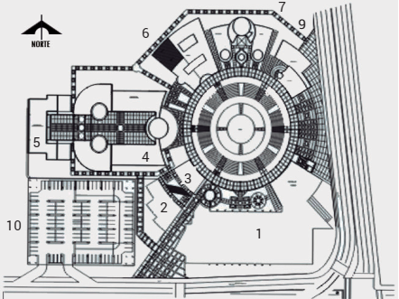 El proyecto del CA, a cargo de la firma local Puebla Arquitectos, se presentó públicamente en marzo de 1996 (Figura 7).17Aprovechando la estructura del antiguo gimnasio universitario y eliminando un foso de clavados y alberca en desuso, la propuesta final tomó literalmente el concepto de centro, configurando una organización espacial radial alrededor de un foro para actividades escénicas al aire libre. Constructivamente, se programaron dos etapas cuyos alcances quedaron como sigue: