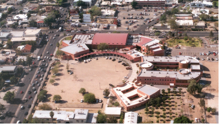 Figura 8 Puebla Arquitectos. Vista aérea del Centro de las Artes, Unison, CA. 2004. En el sentido de las manecillas del reloj: Oficinas de Foros escénicos, Departamento de Bellas Artes, Centro de exposiciones y convenciones, Auditorio-Educadis, Arquitectura y Artes Plásticas, Música.