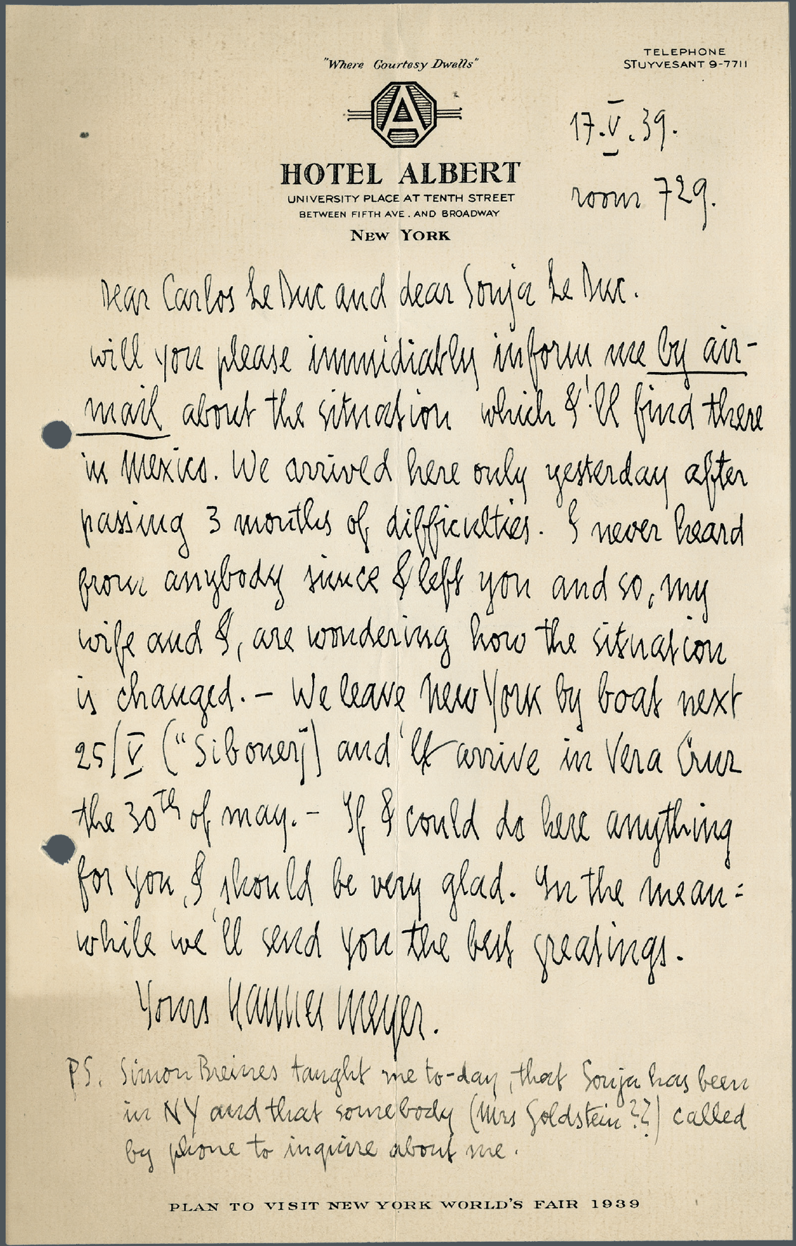 Se trata de cuatro testimonios de la estrecha relación entre Carlos Leduc y Hannes Mayer. El primero, una tarjeta postal de la época navideña, está escrita con tono esperanzador y buenos deseos de un próspero trabajo colectivo una vez que lleguen a México; el segundo, una carta mecanografiada en papel membretado de su despacho en Ginebra, del 14 de febrero, da cuenta de los dramas domésticos por la salud de sus hijos y las peripecias burocráticas que deben sortear para obtener los permisos y visas para viajar al país, los problemas económicos y el volumen de menaje que viajará con ellos, haciendo patente el problema de los navíos que deben pasar, forzosamente, por el puerto de Nueva York para llegar a Veracruz. De ella destacan los grupos de trabajo futuro y las relaciones con los arquitectos Raúl Cacho, Enrique Yáñez, Ricardo Rivas entre otros. La tercera de las cartas, desde la habitación 729 del hotel Albert en Nueva York, da cuenta del tono desesperado de un mes de mayo en el que, después de tres meses de peripecias, narra que finalmente se encuentran en territorio americano. El silencio ante un futuro incierto se transpira de las palabras desesperadas para saber a qué llegarían a México. La última de las misivas se trata de una breve invitación a una reunión -palabra compuesta que podría significar una parrillada- con los jóvenes arquitectos Van Beuren, Grabbe, Cacho y Yáñez, ya en el mes de septiembre, y es testimonio alegre de que el arquitecto Meyer y su familia ya se han establecido en Ciudad de México.