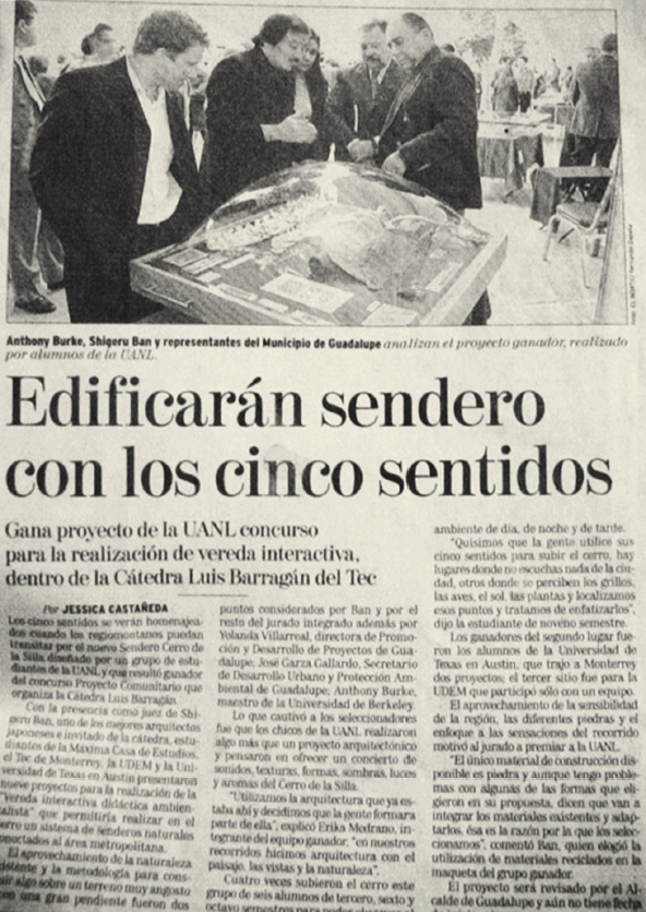 Figura 4 Nota del periódico local El Norte, en donde se anunciaba el proyecto ganador de la Cátedra Luis Barragán en 2002. En la foto aparecen Anthony Burke, Shigeru Ban y representantes del municipio de Guadalupe.