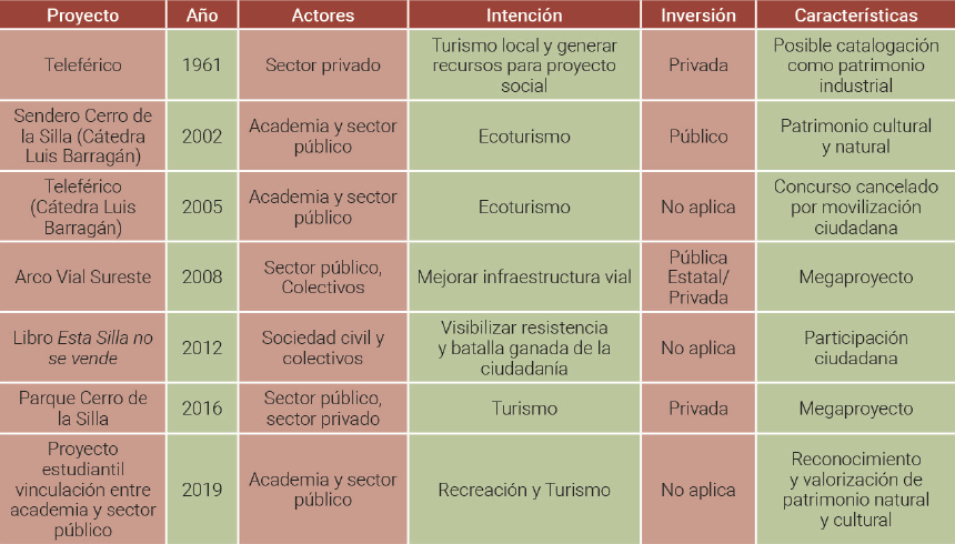 Identificar los proyectos de intervención -desarrollados o no- que se han localizado en el Cerro de la Silla y los impactos generados.