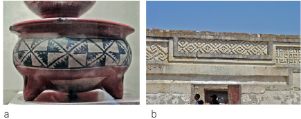 Figura 11 Uso de tramas triangulares y rómbicas en a) Preclásico Chupícuaro y b) Posclásico Mitla, arquitectura.