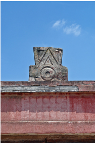 Las almenas del patio del Quetzalpapalotl en Teotihuacan, son ejemplo del uso del símbolo de los triángulos entrecruzados como estructura formal en el diseño de elementos arquitectónicos. Las líneas de la almena sugieren la utilización del símbolo, aunque éste se muestra con proporciones diferenciales (Figura 12).