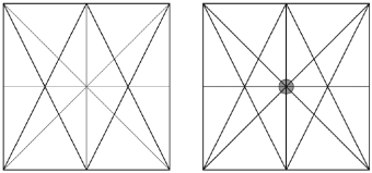 Así, un cruzamiento de dos segmentos de recta es la conformación que por sus cualidades gráficas es capaz de simbolizar dicha concepción dual, donde cada segmento liga o vincula extremos complementarios, “binomios” que acentúan las cualidades que representan, mostrando en el cruzamiento no sólo la oposición de ambas direcciones, sino también la estrecha conexión que los vincula, exponiéndolos en igualdad de magnitud y forma, pero en sentidos opuestos. Por otro lado, la intersección de rectas señala de manera significativa el punto gravitacional o centro que reúne a los opuestos y a partir de él, la posibilidad de rotación, alternancia dinámica y ubicación de la zona o área de equilibrio (Figura 3 a y b).