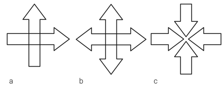 Cuando los extremos de los segmentos se dirigen hacia el centro, en vez de implicar un choque de opuestos, constituyen una confluencia de oponentes que confirma el equilibrio en la dualidad-oposición (Figura 3c).