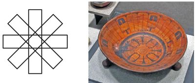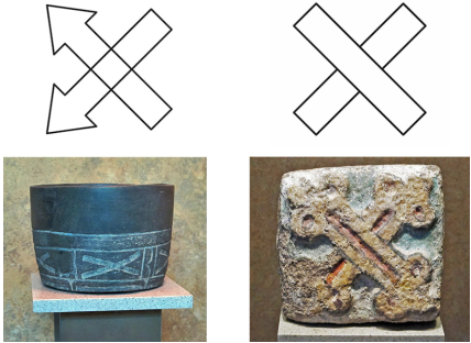 En la observación de los objetos expuestos en el Museo Nacional de Antropología e Historia destacan en número la cantidad de piezas que son portadoras de signos constituidos por la conjunción de cruces. Generalmente, el emblema muestra de manera evidente ambas cruces, pero en muchas otras una de ellas es explícita y la otra tiene una presencia virtual y aún ambas son virtuales a través de puntos, círculos, líneas u otros elementos figurativos o geométricos que conforman quincunces, que son una sumatoria virtual de esta conjunción (Figura 9).