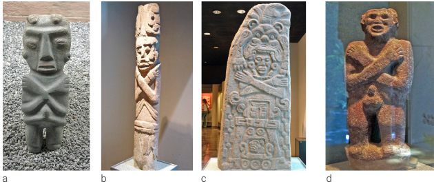 Figura 6 Esculturas de diversas culturas y épocas que muestran la permanencia de la representación de los brazos cruzados sobre el pecho, ubicando o poniendo al corazón en quinta región. a) Preclásico encontradas en el Templo Mayor; b), c) y d) Clásico, costa del Golfo.