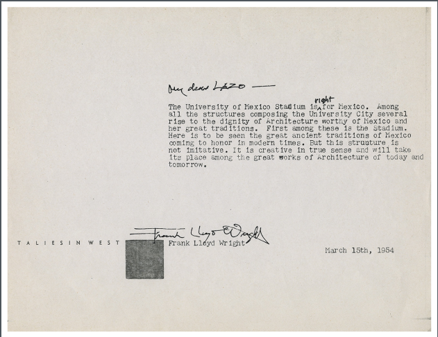 El soporte documental que se presenta en esta ocasión se trata de una nota de felicitaciones enviada por el Arq. Frank Lloyd Wright al Arq. Carlos Lazo Barreiro quien, a su vez, la hizo llegar al Arq. Augusto Pérez Palacios a modo de reconocimiento al estadio. Se encuentra dentro del gran expediente que conforma las diversas etapas de diseño y ejecución del mismo, hasta su transformación en el Estadio Olímpico Universitario.