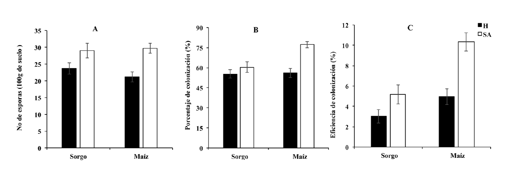 Las especies del ambiente semiárido replicaron el mayor número de esporas, lo que sugiere que la diversidad de especies de HMA no incrementó el número de esporas en el cultivo trampa, sino la capacidad que tienen las especies de replicarse. El porcentaje y eficiencia de la colonización fue mayor en Zea mays en el sustrato del ambiente semiárido; sin embargo, el Sorghum vulgare mostró un comportamiento similar en ambos sustratos. Esto puede sugerir que existe selectividad entre las especies de HMA hacia el hospedero y ésta puede estar dada por la dependencia micorrízica del cultivo, las especies de HMA involucradas y las características del sustrato. Helgason et al. (2002) sugieren que existe selectividad entre los HMA y plantas que colonizan, lo que favorece el crecimiento y desarrollo. Bainard et al. (2014) demostraron que existen factores que influyen en la abundancia y diversidad de especies de HMA, siendo el pH y las propiedades químicas del suelo los que impulsan variaciones de las comunidades de HMA en el suelo.