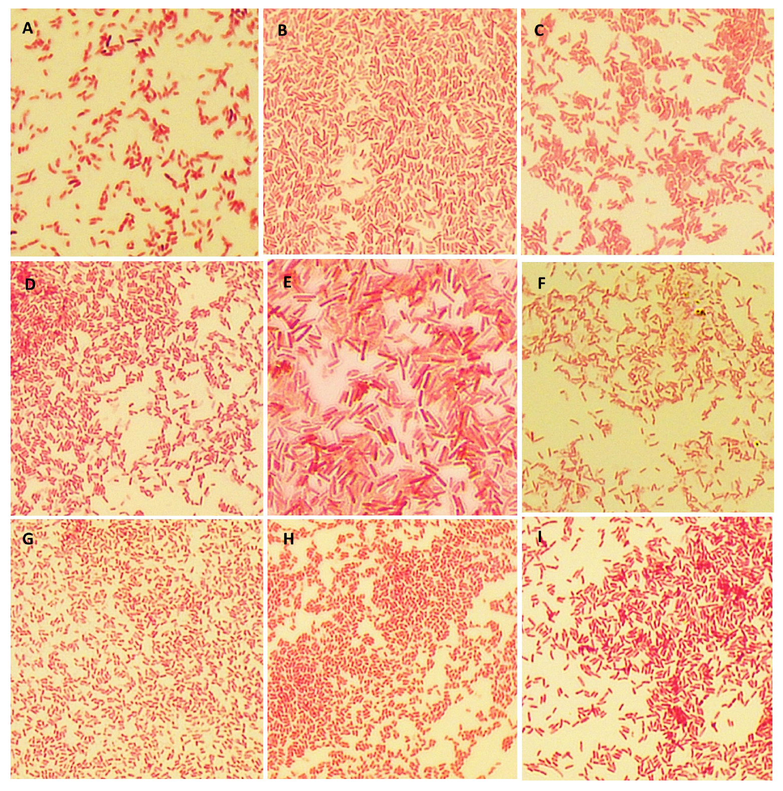 Figure 2 Microscopic images of Gram-stained bacterial isolates. A: Pseudomonas sp. (B1). B: Pseudomonas sp. (B4). C: Pseudomonas sp. (B3). D: Serratia liquefaciens (B5). E: Bacillus sp. (B7). F: Pseudomonas sp. (B8). G: Pseudomonas sp. (B11). H: Pseudomonas sp. (B12). I: Pseudomonas sp. (B13). Magnification 1000x.
