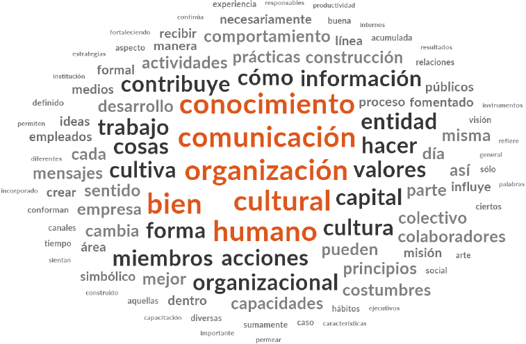 En el análisis textual fue posible identificar la relevancia de cada uno de los capitales (cultural, simbólico y económico) en el ámbito de trabajo de los entrevistados. Cabe señalar que en los tres tipos de capital se hizo referencia a los términos organización y comunicación. En la Figura 1 se presenta la nube de texto que se formó con respecto al capital cultural que, como puede observarse, destaca el conocimiento, la denominación de este como un bien y la importancia del ser humano, así como la propia referencia a la palabra cultural y en menor medida la palabra cultura. Realizando un análisis interpretativo de las entrevistas es posible identificar que para los especialistas en comunicación, ya sean consultores, académicos o profesionales, el capital cultural tiene clara relación con todo aquello que constituye el conocimiento como es la información, las prácticas, mensajes, proceso, trabajo, capacidades, ideas; sin embargo, también hay grandes referencias hacia la parte colectiva, en palabras como colaboradores, contribuye, pueden, públicos, recibir, empleados, conforman, miembros, social y colectivo. Es decir, el capital cultural requiere trabajarse en comunidad, no en lo individual, su sentido se forma en su carácter colectivo y en el momento es que su desarrollo mismo forma parte de un resultado compartido. Para este fin, la comunicación tiene un papel fundamental en tejer los lazos que hagan posible esta participación conjunta que forme el capital cultural en la organización.