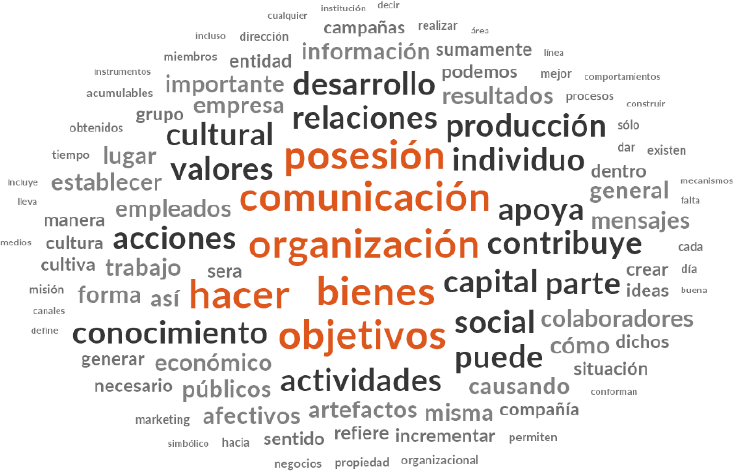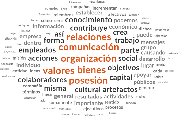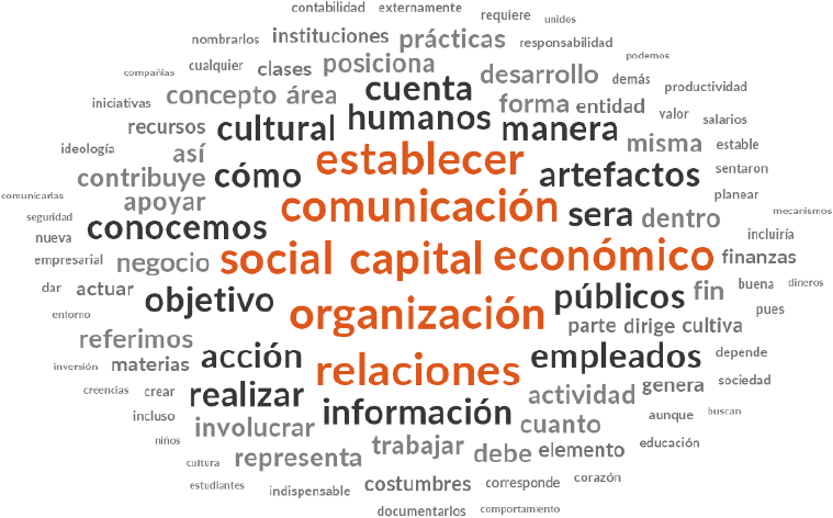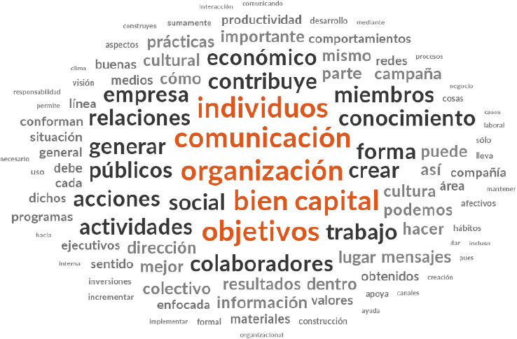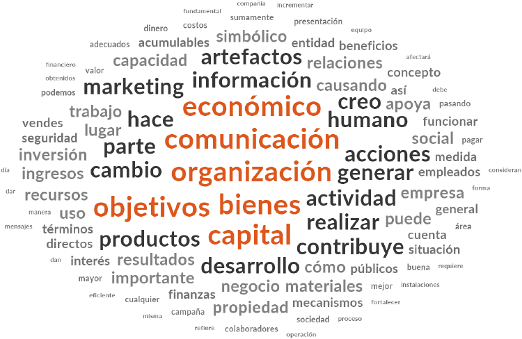 En la Figura 2 se muestran los resultados respecto al capital económico en lo que destaca la mención a los objetivos, bienes, artefactos, información, productos, resultados y la propia referencia a la palabra económico. El análisis interpretativo en cuanto al capital económico se presentan en primer lugar claramente los referentes teóricos básicos como son el capital mismo, los bienes, beneficios, productos, resultados, artefactos, materiales, recursos, ingresos, inversión, negocio e incluso la información por el valor que engloba en sí misma; sin embargo, también se encuentran referencias claras hacia los referentes que hacen posible la creación de este tipo de capital como son objetivos, acciones, e desarrollo, contribución, creación, cambio, relaciones, mecanismos, trabajo e importancia, entre otros. En este sentido, el capital económico se reviste de una serie de causas o acciones que lo posibilitan y que en general hacen referencia al esfuerzo requerido para lograrlo, dentro del cual la comunicación es una pieza clave para dar seguimiento, impulsar y coordinar acciones para el desarrollo de relaciones y el trabajo mismo requerido para cumplir con los objetivos y formar este capital.