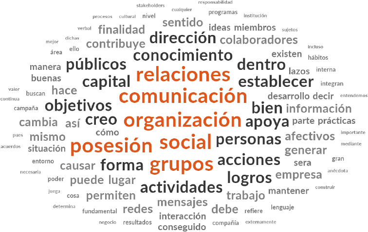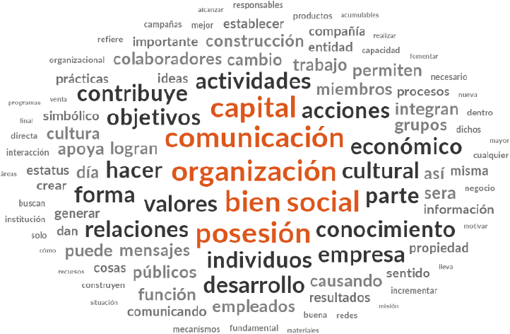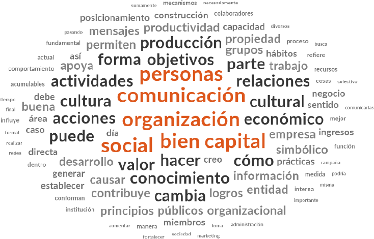 En el análisis textual sobre capital social que se presenta en la Figura 3 se muestra la presencia destacada de las palabras relaciones, posesión y grupos, y la propia referencia a la palabra social. En el análisis interpretativo para el caso del capital social es clara la referencia a la persona en sus distintas acepciones como miembros, colaboradores, sujetos, públicos, personas, grupos; y lo que en suma realizan las personas y que se refleja en verbos como apoyo, contribuye, causar, existen, permiten, generar, mantener, puede, cambia, buscan; o también en forma de resultados y palabras relacionadas como relaciones, logros, actividades, acciones, objetivos, finalidad, lazos, redes, afectivos, trabajo, interacción, poder, nivel, buenas. Es destacable que la palabra confianza no fuera un referente mencionado mayormente como parte del capital social, sin embargo, la comunicación se puede comprender como el eslabón que apoya, contribuye, permite, genera, mantiene los lazos, las redes y las relaciones a través de la interacción hacia los logros requeridos.