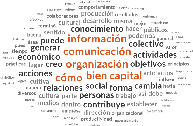 La guía de entrevista estructurada con preguntas específicas en donde el entrevistador se sujeta exclusivamente a estas a fin de explorar las visiones del profesional, académico o consultor de comunicación organizacional con respecto a las categorías del concepto de capital social, cultural y económico a las organizaciones y cómo es la contribución de la comunicación a la formación de estos. La metodología que se utilizó para el análisis de las entrevistas fue en un nivel textual, contextual e interpretativo. En el nivel textual se formaron nubes de texto para identificar los principales términos o códigos utilizados en cada categoría; mientras que en el nivel contextual se hizo la búsqueda de sentido a partir de conjuntar la visión de la comunicación en la formación de cada categoría de capital (social, cultural o económico); y en el nivel interpretativo se contrastaron las respuestas con las características de cada informante en términos de las categorías de género, escolaridad y especialidad (en comunicación o en otras disciplinas).