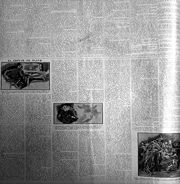 En cuanto a la publicación de textos ficcionales en el suplemento, podemos observar que los textos ilustrados eran principalmente aquellos traducidos de autores extranjeros y acompañados por dibujos en los que se puede distinguir la firma de ilustradores foráneos, aspecto que permite identificar que han podido ser tomados de otras publicaciones. Con respecto a los textos ilustrados, en general, los relatos publicados en el suplemento se acompañaban de tres imágenes escalonadas de tamaño mediano que representaban escenas narrativas del texto, así se observa, por ejemplo, en “El espejo de plata”, de Arthur Conan Doyle: